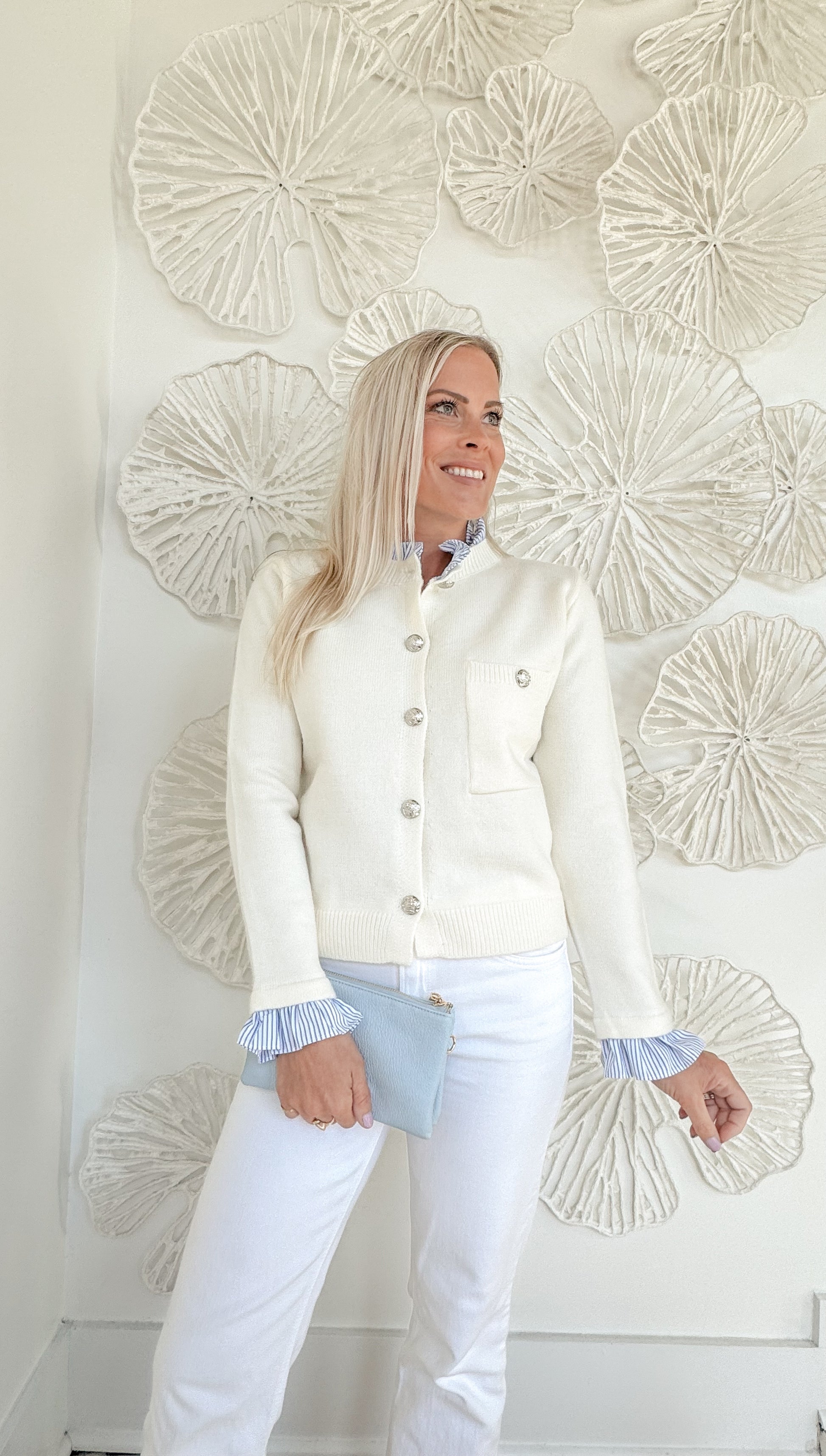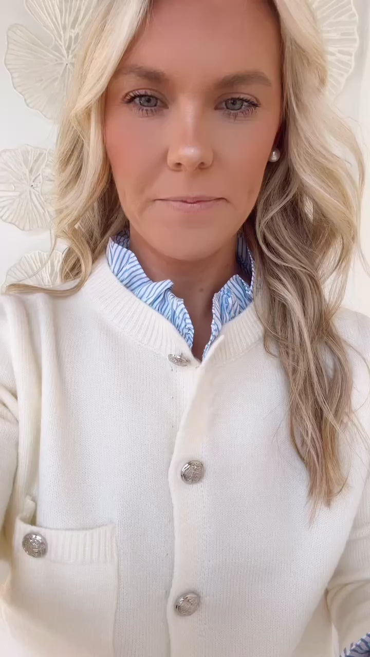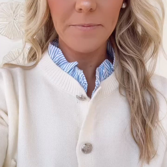 Cream Blue Ruffle Collared Button Sweater