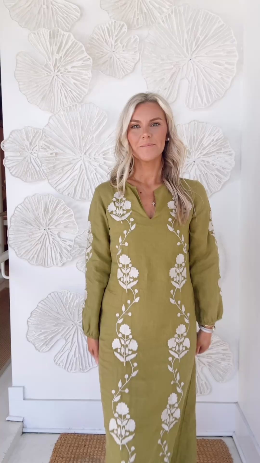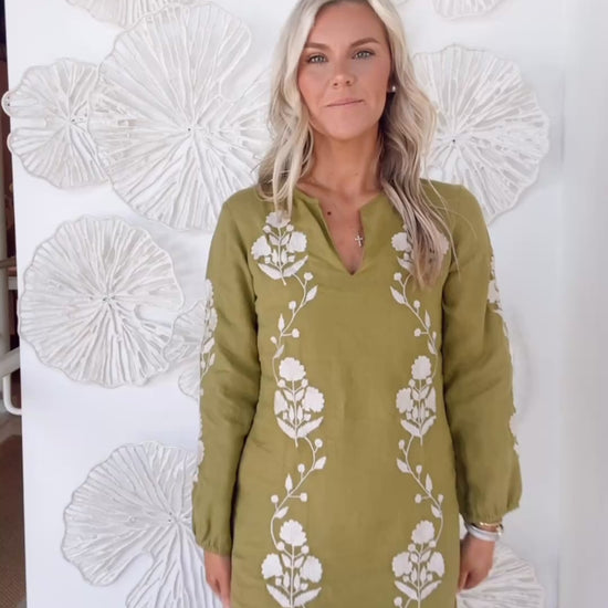 Olive Green Floral Embroidered Motif Long Sleeve Maxi